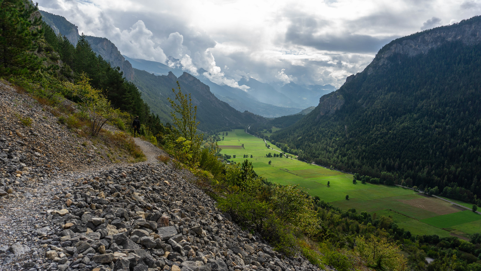 Hiking to the climbing crag La Grande Falaise at Freissinières, Briançon in France.