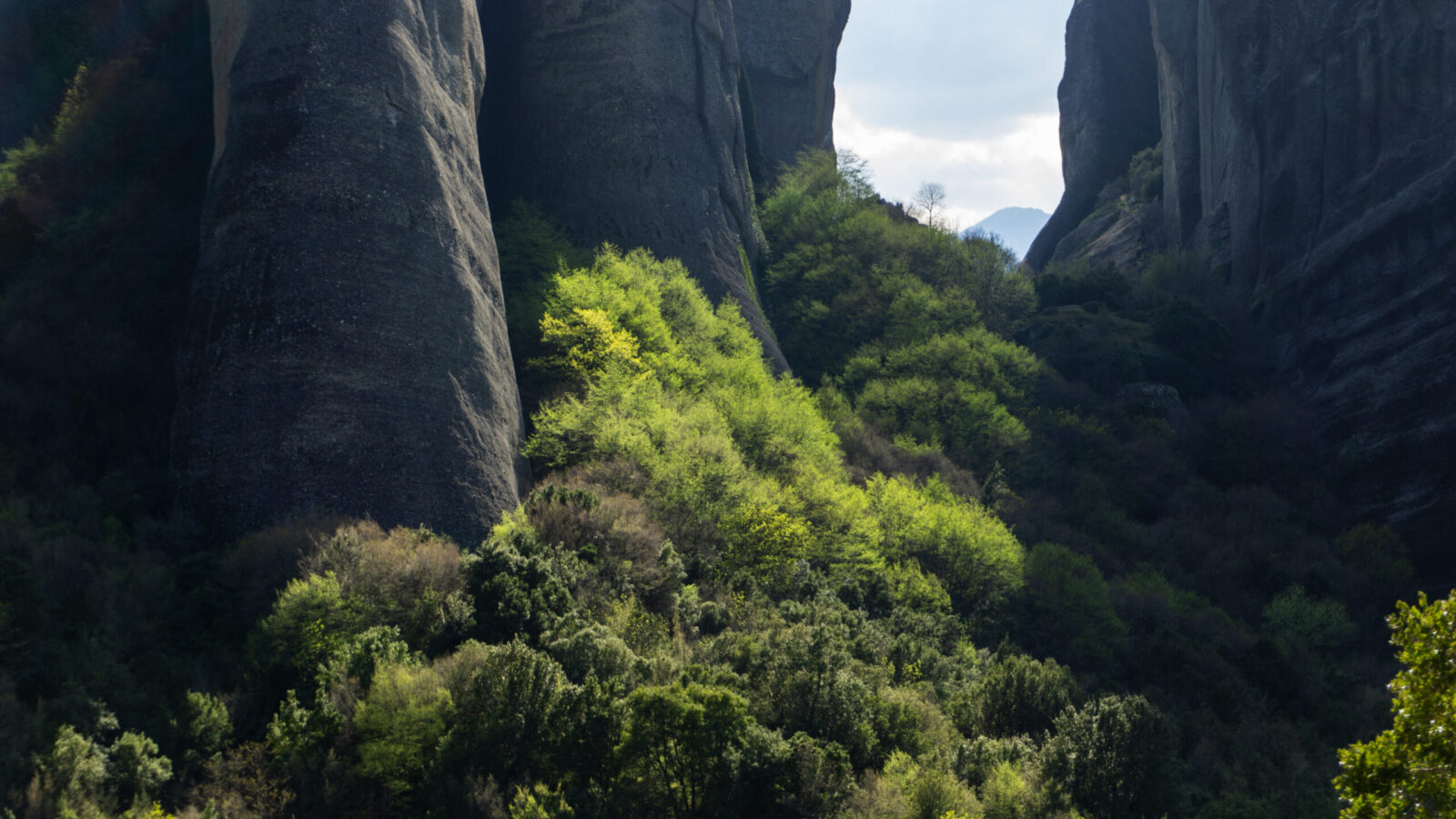 Lush green forest between the conglomerate towers of Meteora, Greece.